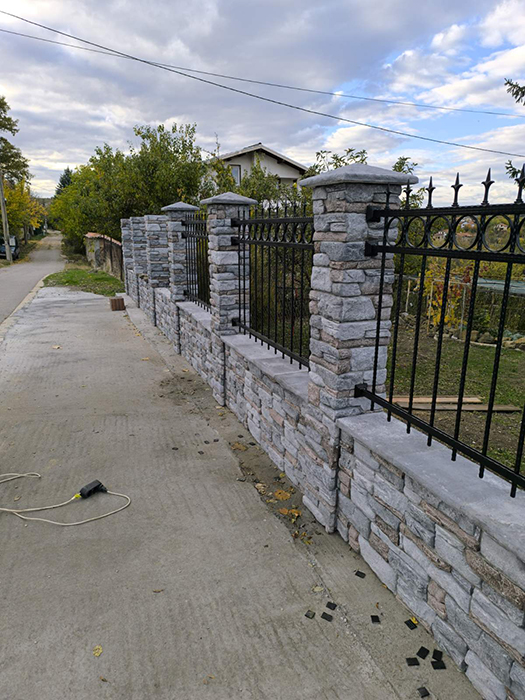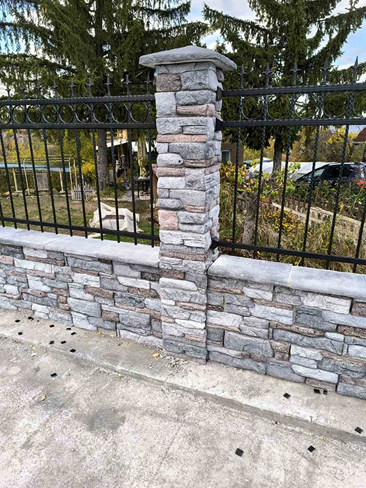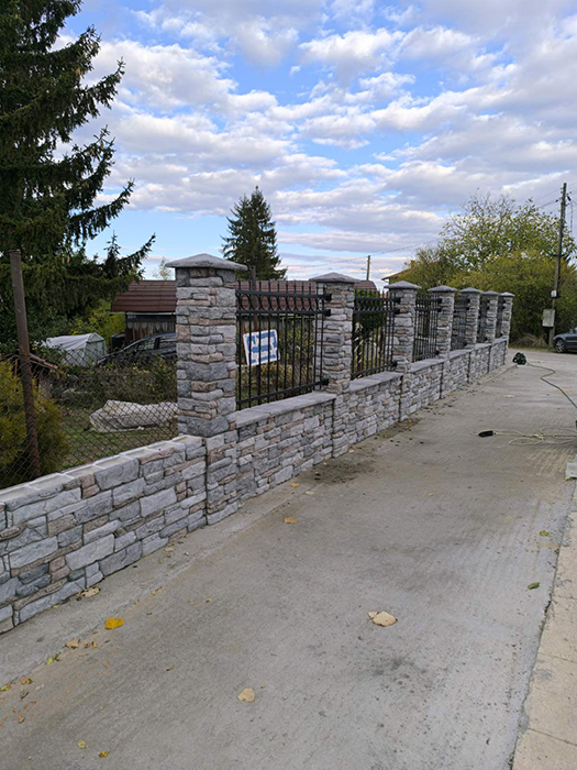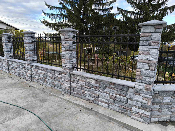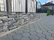The bricks are 2-3-4-sided, embossed blocks measuring L-40 cm. W-20 cm. H-12.5 cm. imitating relief and color stone. There are made by weatherproof concrete.
